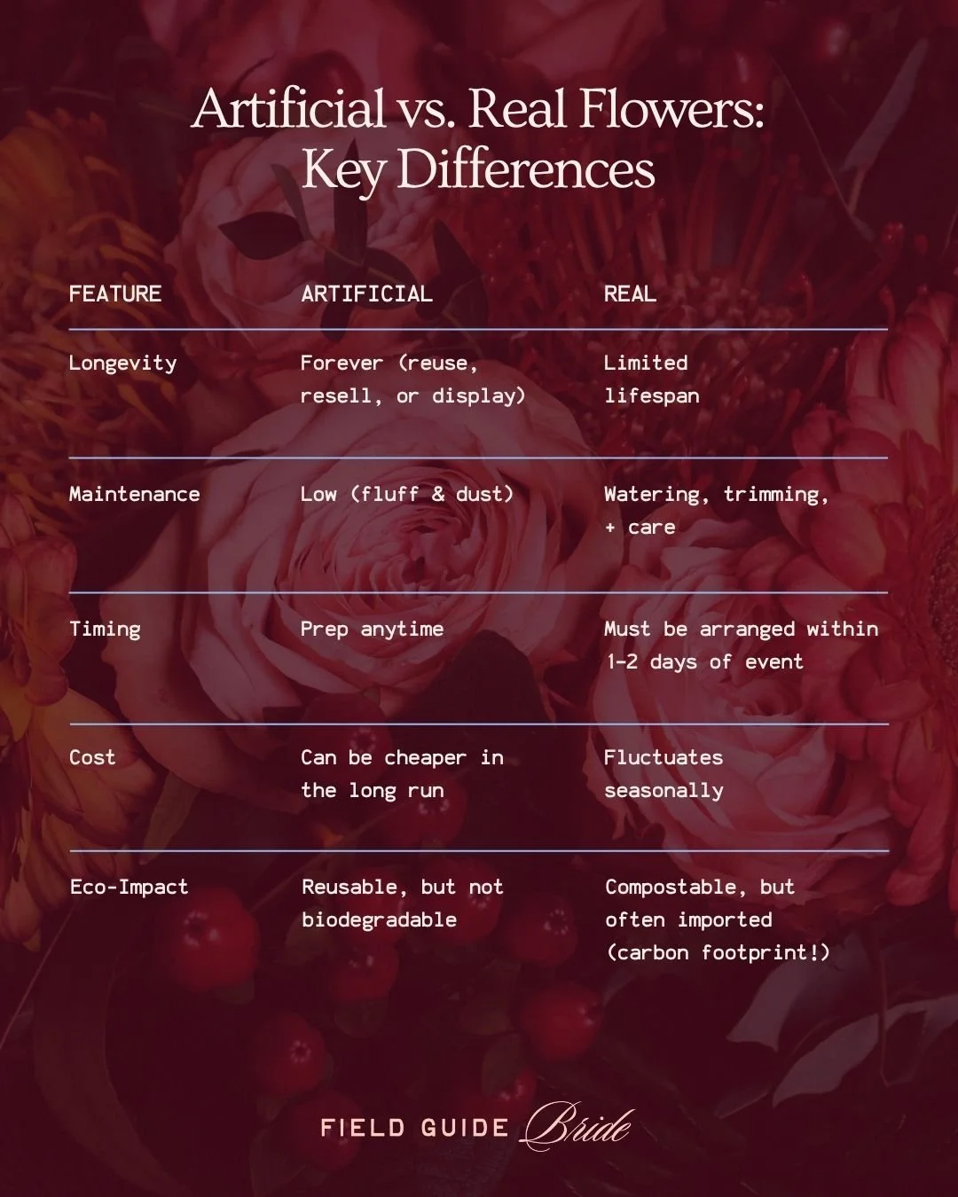 Artificial wedding flowers are no longer the “budget backup plan”. They’re a smart, beautiful, and low-stress choice that gives you control over your timeline, costs, and creative vision. Whether you go full faux or mix in a few real elements (like greenery or local blooms for scent), the modern artificial flower world is full of possibilities that look (and photograph) just as stunning. After all, your wedding should be about you, instead of wondering if your peonies survived the car ride or not.