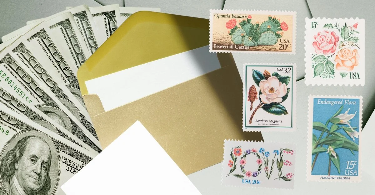 This stays under one ounce and costs one Forever stamp at 78 cents. If you add a response card and response envelope, you'll likely hit 1.2 ounces, bringing you to $1.07 per invitation. For 150 invitations, that's $117 to $161 depending on whether you include the response elements.
